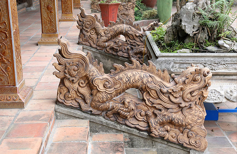Tại các bệ cầu thang là hình rồng tạc phong cách thời nhà Lê.